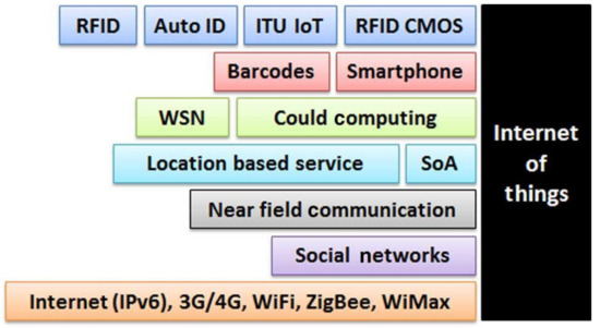 The middleware layer is responsible for ensuring and managing services required by users or applications. When the term IoT first appeared, it referred to uniquely identifiable interoperable connected objects using radio RFID technology. By connecting the RFID reader to the internet, readers can automatically and uniquely identify and track objects attached with labels in real time. Figure 3 illustrates technologies and devices used to support the IoT. The key technologies include RFID and a wireless sensor network (WSN) and other relevant technologies such as barcodes, smart-phones, cloud computing, location-based service, service-oriented architecture (SOA), near field communication and social networks.