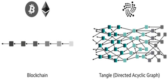 In the decade since its inception, the BCT model has faced growing difficulties. Two of the largest challenges facing BCT are its inability to handle a large volume of transactions simultaneously and its high transaction fees. In order to resolve these drawbacks, a more recent solution is to use a directed acyclic graph (DAG) to implement a distributed ledger [45,46] instead of the BCT linear structure as shown in Figure 4. In mathematics, DAG is a graph that travels in one direction without cycles connecting to other edges. An example of DAG-based distributed ledger technology is the tangle implemented by IOTA [47,48].