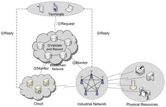 Industry 4.0 is not a far-fetched concept, and the complexity of such systems requires a more robust security solution [53]. To establish secure remote user authentication with detailed access control for Industry 4.0 applications, the author in [53] offers a new framework based on a BCT named BSeIn. The proposed framework exploits the underlying characteristics of the BCT as well as several cryptographic materials to create a decentralized, confidential and auditable solution. In particular, it used anonymous terminal authentication (i.e., attribute-based signature (ABS)), efficient gateway authentication (i.e., message authentication code (MAC)) and confidentiality of requested messages (via certificateless multi-receiver encryption (CL-MRE)). In addition, it is demonstrated that BSeIn is safe, and an evaluation of the performance of the prototype is addressed. The latter, contains a hierarchical framework comprising four tangible layers, which is designed to vertically integrate inter-organizational value networks, an engineering value chain, manufacturing factories, etc. The conceptual framework allows a flexible and reconfigurable smart factory to be efficiently implemented. However, authors need to consider security inherent in existing (stand-alone) devices and networks as well as those that may arise in such integrations. Especially the existing solutions are insufficient to address these fundamental security concerns. BSeIn is a BCT-based system for secure mutual authentication to enforce fine-grained access control polices. The proposed system (with integrated attribute signature, multi receiver encryption and message authentication code) is designed to provide privacy and security guarantees such as anonymous authentication, auditability and confidentiality. BSeIn [53] also scales well due to the utilization of a smart contract. Then, authors evaluate the security and performance of BSeIn. The participants involved in BSeIn include terminals, a BCT network, a cloud, an industrial network and physical resources, as shown in Figure 7. Terminals are often some remote telecommunication devices (e.g., mobile devices) that can remotely request access or process the commands.
