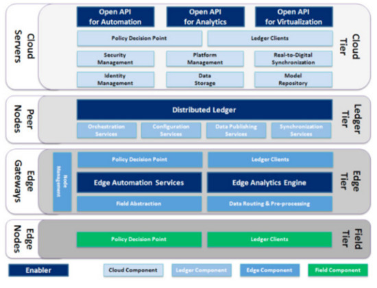 The final work is presented in [43], which provides a comprehensive overview of the FAR-EDGE reference architecture (RA). The FAR-EDGE RA is the conceptual framework that drives the design and the implementation of the FAR-EDGE platform, which describes the basic elements necessary for the development of digital automation platforms using advanced computing capabilities and BCT for industry. In addition, the paper also describes the design of a platform that adheres to the FAR-EDGE RA, including details of the various components it includes and how they interact. The design for each individual tier of the FAR-EDGE platform, which adheres to the RA, is presented in Figure 8. The different proposed layers are field tier, edge tier, ledge tier and cloud tier. The field tier is the realm of edge nodes (EN), which connect the real world to the digital world of information technology (IT) and vice versa. The ENs have enough computing capabilities on board to be active actors in a CPS, i.e., intelligent devices that are conveniently called “Smart Objects”, ranging from a simple PLC to a fully-autonomous smart plant. Typically, smart objects are controller boards with some significant processing power and a good network connection but lack any (usable) local storage. The platform defines two components that can be run on such a device, namely policy decision point (PDP) and ledger clients. At the platform level, edge computing is supported by seven components, two of them with enabler status such as edge automation services, an edge analytics engine, field abstraction, data routing and pre-processing, policy decision point a system entity that makes authorization decisions for itself or for other system entities that request such decisions, ledger clients and node management. All Components are meant to be deployed on edge gateway (EG) machines. The ledger tier is where the full potential of edge computing is unleashed. It allows for truly distributed process logic to work in use cases that require some level of coordination as is true for most industrial scenarios without any centralized service being in charge of it. It employs the distributed ledger and smart contract patterns both key elements of BCT technologies. The peer nodes run the distributed ledger enabler and the orchestration services, configuration services, data publishing services and synchronization services components. Finally, the cloud tier includes a total of eleven components, three of them having enabler status. They are classified as (i) public cloud services, which are accessible through three open application programming interfaces (API)s, namely the open API for automation, the open API for analytics and the open API for virtualization; (ii) internal cloud services, including identity management, model repository and data storage; and (iii) platform cloud tools, including security management, policy decision point (edger clients, real-to-digital synchronization) and platform management components.
