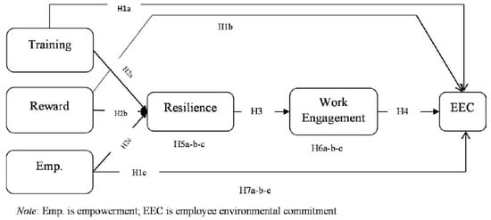 Therefore, green HRMPs (e.g., rewards and empowerment) might promote EEC by communicating the service provider’s understanding of green human resource management [5,39]. Green training helps service providers understand how to take in and embrace environment-centered abilities that can yield long-lasting EEC [40].