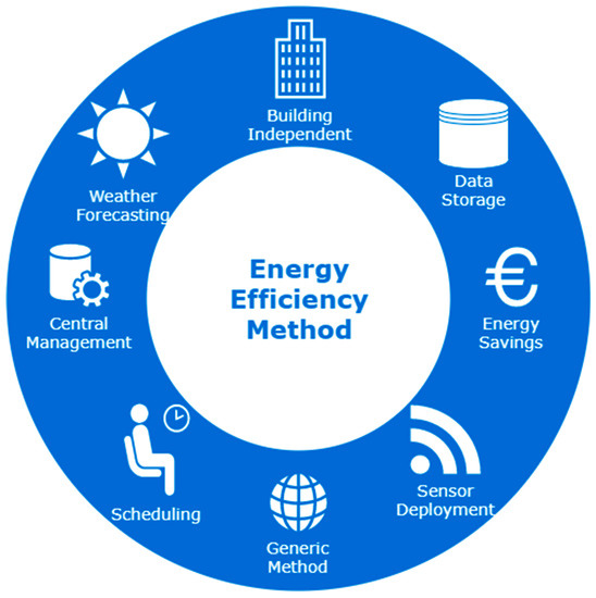 Figure 4. Subtopics for an energy efficient zone. - Weather usage: the design should take into consideration the building orientation. The way a structure is situated on a site and the placement of its windows, rooflines, and other architectural features is critical for efficiency. Weather data could be incorporated by outdoor sensor agents or by using a public Application Programming Interface (e.g., Meteostat’s API offers historical and daily weather data from anywhere [90]).