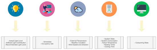In an SC, the integration of systems can be used to reduce operating costs through experimentation with a digital twin model. This would result from applying most of the engineering and architectural characteristics mentioned before. If we divide the whole campus into zones, the smart system can easily control each room’s energy consumption [96]. We assume that the data sensed by IoT agents for the SC’s comfort must be useful enough for a system that aims to find energy efficiency as well, which can use them to generate efficiency improvements. However, these benefits should not be imposed on the comfort of the occupants of the building. Our proposal aims for efficient energy usage by using the data measured by sensors deployed inside the building for the TC, AC, VC, and IAQ assessment (Section 2.1), and other accessible data such as room schedules and weather forecasting (Figure 5).