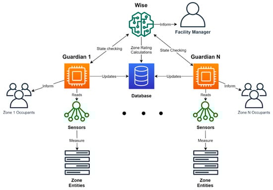 In the SC that we propose, a zone defines a limited space within the building. The zone, which is usually a room or a section of the building, is described by a list of parameters such as capacity, occupancy schedules, daylight availability, current and historical occupancy, and comfort metrics (e.g., temperature and humidity). The guardian, a digital agent, is responsible for a unique zone (in a one-to-one relationship). It has the autonomy and responsibility to control the IoT devices and maximize the comfort and energy efficiency of the zone. Once the guardian gathers the data from the IoT sensors, it processes the data and stores them in the storage subsystem. Moreover, the guardians relay this information to a digital entity that aggregates them (and is on top of the hierarchy), the wise module. The wise module contains the support decision system that manages the entire building and guides each guardian, with the overarching goal of providing optimal comfort and energy efficiency (Figure 6). Thus, the wise module is the main actor for the inferred level of the smartness of the campus [97].