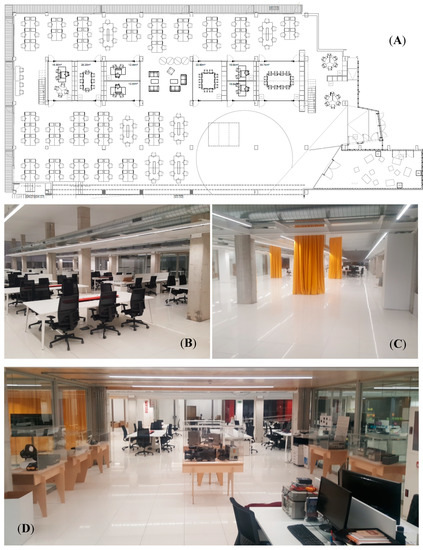 IoT institute at La Salle-URL: (A)—architectural plan, (B)—maker Space, (C)—agora, (D)—city lab.