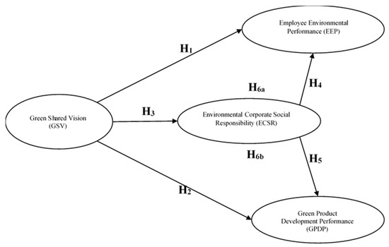 Environmental strategies such as developing sustainable products and procedures also produce a positive effect on the environment as well as extend business life and public perceptions of responsibility [60]. Based on the concept of signal theory elements of Connelly et al. [69], in this research, in EEP, employees comply with regulations with consistent social communication. The GPDP process causes less damage, has low negative impact on the environment, is less harmful to human health, uses recyclable materials, and adopts more energy-saving processes or a reduced amount of packaging. This can be considered the signal receiver (EEP is the response of the employee to the signaler) and feedback (GPDP is the response of the employee to the signaler) from signal theory [69]. Therefore, when the company formulates a GSV, it establishes the company’s green management expectations and value signals, which are transmitted to the signal receivers (company employees and related stakeholders) through signalers (ECSR managers). In the ECSR context, the company provides related resources, and the employees feel the support of the organization and work harder [83]. Therefore, the research makes the following inferences from the expected value and signal perspective: (1) On the basis of the perspective of expectancy–value theory, a GSV can aid in improving employee behavior [11,27,29,84] and GPDP [11,48]. (2) According to signal theory, GSV can transmit signals to the receiver through the signaler and can thus improve GPDP [85,86,87]. (3) The signal must pass to the receiver through the signaler; otherwise, the signal receiver cannot receive the message [69]. Therefore, ECSR has an intermediary role, and this article proposes the following Hypotheses 4 (H4), 5 (H5), 6a (H6a), and 6b (H6b):