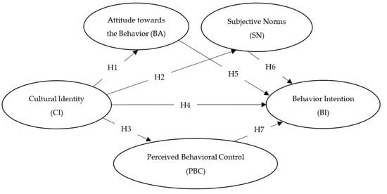 Based on the preceding hypotheses, the main dimensions of this study include cultural identity, attitude toward the behavior, subjective norms, perceived behavioral control, and willingness to consume. Figure 1 presents a corresponding model diagram.