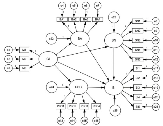 CFA aims to test whether the relationship between a factor and the corresponding measure item conforms to the theoretical relationship designed by the researcher. Among the relevant indicators, CR is the combination reliability, 0.7 is the acceptable threshold, and AVE is the average variance extracted value, which is recommended to be greater than 0.4 to test the internal consistency. In this study, CFA was conducted on five measurement dimensions: cultural identity, behavioral attitude, subjective norms, perceived behavioral control, and consumption intention. Table 3 shows that CR of each dimension is greater than 0.7, AVE is greater than 0.4, and the standardized factor loading of all measurement indexes on their respective latent variables ranged from 0.690 to 0.885, which is greater than 0.5 and less than 0.9, indicating that the basic fitness of the model is good. The larger the factor loading value, the greater the variation that the index variable can be explained by the structure; thus, the index variable can effectively reflect the structural characteristics to be measured [72]. Through the CFA of each dimension, the model built in this study is of good quality, and the index can effectively reflect the structural characteristics to be measured.