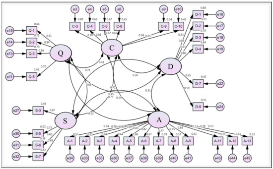 In the process of building a final model, the measurement variables of C-1, C-2, C-8, Q-4, D-5, D-6, D-8, D-10, S-2, S-4, A-10, which displayed standardized regression weights of less than 0.5 and the measurement variables of C-1, C-2, C-7, C-8, C-9, Q-4, D-5, D-6, D-8, D-10, S-1, S-4, A-10, which showed SMC of less than 0.4 were removed. The goodness of fit of the final measurement model was = 2435.376 (p < 0.001), TLI: 0.907, CFI: 0.915, RMSEA: 0.060 (Table 1), thus the model is believed to be suitable in that it satisfies CFI < 0.9, TLI < 0.9, RMSEA > 0.08, which is the general fitness standard [40] of the general fitness indices (RMSEA, TLE, and CFI). The confirmatory factor analysis found that the paths reaching from latent variables of COVID-19-related factors (C), factor of self-isolation upon entry and departure (Q), destination-related factor (D), social atmosphere towards overseas travel (S), and level of aircraft/airport management related to infectious diseases (A) to the measurement variables were all significant (p < 0.01). In addition, a review of the correlation coefficients between factors and standard errors showed that the validity of the determination was certain.