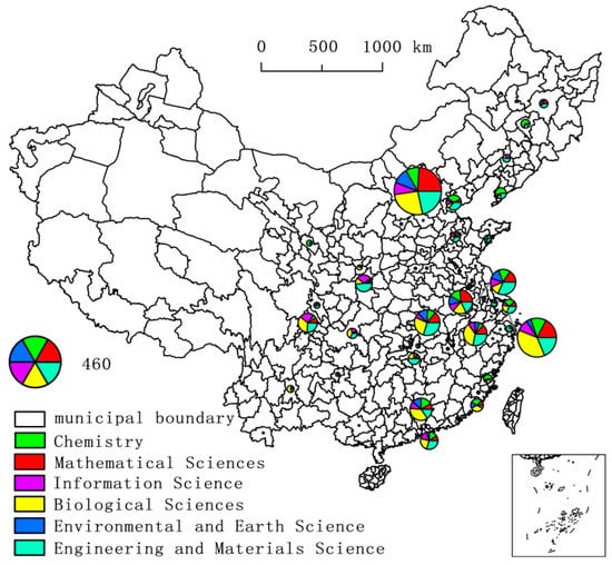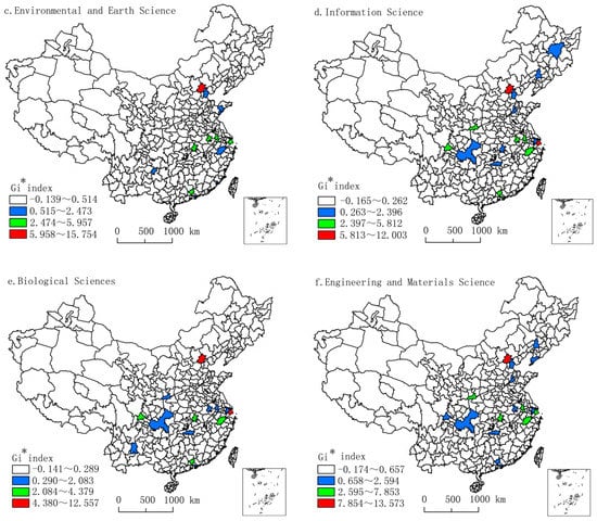 (1) Generally, the sum of hot spots is the least in all professional subjects, showing Beijing as the uppermost hot spot, and Shanghai and some province capitals as second-tier cities. This indicates a strong connection between the spatial structure of Chinese science and political resource allocation [20]. In particular, Beijing is shown as the core city that attracts overseas high-level young returned talent, owing to its numerous well-known universities, research institutes, innovation resource endowments, strong comprehensive competitiveness, and the best quality of life. (2) By comparison, the academic fields represented in Shanghai, shown as the first-level hotspot, are of great importance for more sub-hot cities, and the spatial character is scattered, as shown in Table 3. (3) These phenomena may be attributed to the spatial divergence caused by knowledge priority and legacies of China’s Soviet-style innovation system. Science, Technology, Innovation (STI) science requires the specificity of coded knowledge that spans beyond spatial limits and is inclined to be located in knowledge hubs and global cities. Doing, Using, and Interacting (DUI) knowledge requires more tacit knowledge and is involved in more industrial cities. One cause has been, until recently, the legacy of China’s Soviet-style S&T system. China primarily attempted to replicate the Soviet Model to organize research institutes in several main cities to potentially provide well-trained engineers and new ideas to the local firms in industrial bases.