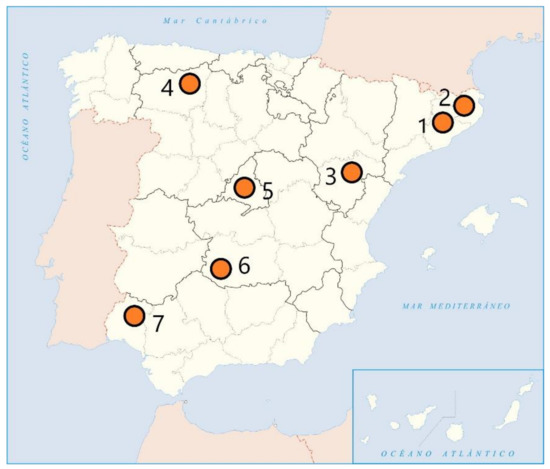 The sites analyzed are distributed throughout several regions of the country, in different locations, and always with distinctive features. They are all united by the fact that they form part of the Spanish list of the main elements of industrial heritage, with very interesting new tourist-use experiences [45]. The places are as follows (Figure 1): Industrial colonies on the river Llobregat (Catalonia), industrial colonies on the rivers Ter and Freser (Catalonia), Andorra mining area (Aragon), Sabero Ironworks (Castile and Leon), Madrid slaughterhouse (Madrid), Almadén mining area (Castile-La Mancha), and Rio Tinto mining area (Andalusia).