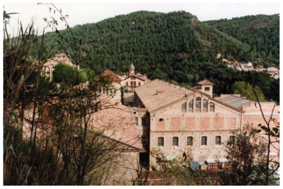 Many factories, located in Catalonia’s hinterland to benefit from the advantages of being far away far from the convulsive social and union demands of Barcelona during the 19th century, represent an extraordinary example of historical industrialization related to the textile sector. This model of industrial implantation radically modified the previous pre-industrial landscape and created factory towns as alternative establishments to the traditional agricultural ones. This is a complex fact in which using water as an alternative to using coal, and the countryside’s low wages, social peace, legal incentives for the occupation of sparsely populated territories, etc. came into play. The main builders of this dense network of factory towns were the local manufacturers, driven by the profits of a booming textile sector, while the public administrations were hardly involved at all. As a result, what one might call industrial fiefdoms emerged, bringing old medieval memories of workers submitting to business and religious power. Indeed, the two most important parts of any colony, apart from the factory, were the owner’s residence (called the “master’s tower”) and the neo-Romanesque or neo-Gothic church [32,52,53].