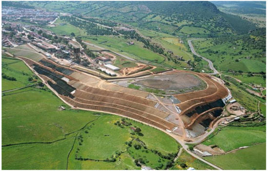 The idea of turning the area into one of the country’s top cultural and tourist sites is why it had to be regenerated in order to reduce the environmental impacts. The enormous quantities of tailings from mining operations and the slag from metallurgical processes built up over time in the San Teodoro slag heap, which occupied an area of nearly 10 ha and was a size equivalent to 3.5 million tons of hazardous materials, due to its high mercury content. In 2004, the authorities drew up the renaturation project and decided to encapsulate the slag heap to ensure it remained stable and waterproof. At the same time, they decided to make the existing slopes gentler so that the slag heap’s artificial forms would be more in harmony with the area’s natural slopes, reducing the initial slope of 36° to the current 25° (Figure 3). The land cover has been restored to merge the structures better into the landscape using autochthonous, fast-growing species to reduce erosion as soon as possible.