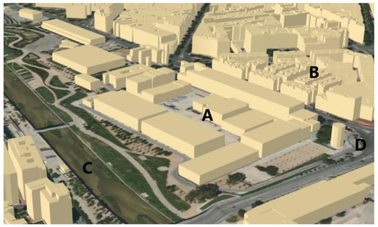 Madrid slaughterhouse: (A) Buildings of the old slaughterhouse; (B) Pico del Pañuelo Workers’ Colony; (C) Manzanares river; (D) Legazpi Square. Source: Geoportal of the Madrid City Council and own elaboration.