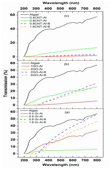 Algal strain is considered as a biofertilizer with many spectral properties due to the presence of several pigments and its photosynthetic nature, and therefore the effect of including it with nanomaterial of certain optical properties must be monitored. Figure 1 shows the transmittance spectra of reference algal cells alone and with other components in the presence of different carbon nanomaterials as a function of wavelength. The transmittance of the algal cells alone was found to be 50%. This optical transmittance of algae was decreased by the graphene concentration of 0.4 to 0.8 mg/mL, but if bacterial cells were added, the optical transmittance of graphene at 8 mg/mL increased to the near normal algal transmittance. Also, optical transmittance of GO and CNT increased when the concentrations increased from 1 to 2 mg/mL and 0.4 to 0.8 mg/mL, respectively, especially in the presence of bacteria. GO, specifically, gave better transmission than the rest of the carbon nanomaterials. It is interesting to note that the maximum peaks associated with chlorophyll (a) in the visible region (600–700 nm) were clearly observed for a high concentration of GO mixed with the alga (2 GO-Al). It is important to report that GO is more hydrophilic than graphene and CNT due to the high level of oxygen-containing functional groups on the basal plane and is reported not to inflict damage on alga [27]. GO bears negative surface charges containing hydroxyl and epoxide functional groups and has a colloidal stability in biological media [28,29]. The transmittance spectra of the mixture of algal cells, nano-carbon material, and rhizobacterium were studied (Figure 1). The transmittance properties were clearly improved by introducing rhizobacterium into graphene/algae cells (Figure 1a), whereas no major modification was observed when rhizobacterium was introduced into GO/algae cells (Figure 1b). However, transmittance decreased when rhizobacterium was introduced into CNT/algal cells (Figure 1c). Moreover, in the range of UV light (<300 nm), the transmittance of bio-composites was significantly reduced, which meant rhizobacterium absorbed UV light.
