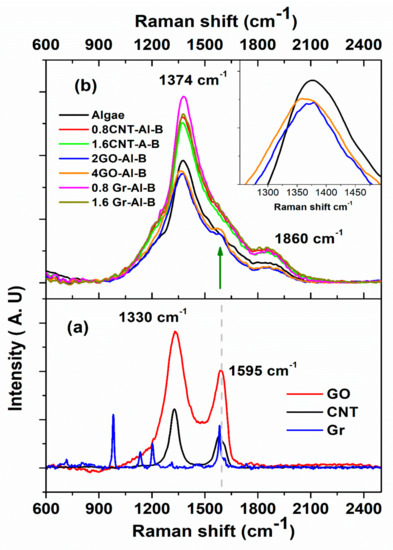 Figure 2 shows the typical Raman spectrum of graphene (Gr), GO, and CNT nanomaterials obtained using a laser excitation wavelength of 633 nm in absence of biofertilsers (Figure 2a) and in presence of biofertilisers (Figure 2b). Two predominant peaks were observed at 1330 and 1595 cm−1 that are commonly attributed to the disorder D and crystalline G bands of carbon nanomaterials alone with no additions, respectively [30,31,32]. The fluorescence was studied when an algal sample was added using a laser excitation wavelength of 785 nm. Figure 2b shows the Raman spectra of algal cells with different contents of nano-carbon materials and bacterium. For the reference algal cells (free of nano-carbon materials), the Raman spectrum showed two peaks at 1374 and 1860 cm−1, respectively, which can be attributed to allenic vibration of carotenoids [33,34].