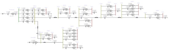 The simulation was performed at one of the selected 275 kV Malaysian subpower system network. The designed system consisted of two generators, eight passive loads, thirty-one transformers and six transmission lines. The combination of this equipment model was used to represent a subpower system network for the purposes of GIC simulation and analysis. The designed model was mainly used to investigate the impact of GIC on the power transformer. The operating frequency of the system was 50 Hz based on system frequency in Malaysia. Custom blocks in PSCAD software [59] were used to model each part of the system. Figure 4 shows the entire model of schematic diagram of the subpower system network.