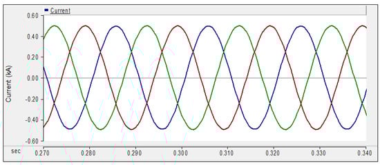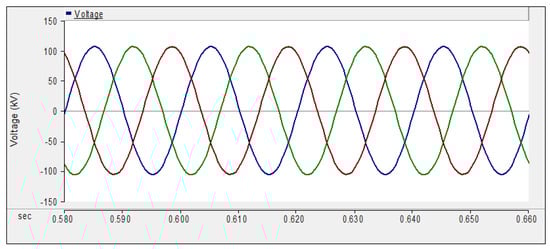 The simulation results under base case condition without GIC are first investigated. The aim is to analyze the voltage and current profiles as a base case to ensure the reliability and stability of the power system. Figure 5, Figure 6, Figure 7 and Figure 8 illustrate the graphs of instantaneous voltage, current, active power and reactive power, respectively, which show that the current and voltage profiles are pure three-phase sinewave and are within the regulated utility Grid Code [60].