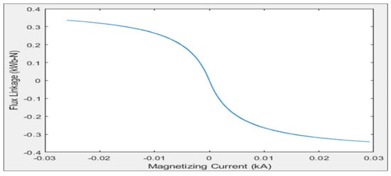 It can be seen that under steady state conditions, flux linkage in the power transformer is sinusoidal and the magnetizing current is within the linear region. Hence, in this case, the hysteresis curve, as expected, is symmetrical around zero as shown in Figure 9.