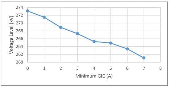 Referring to this figure, GIC of 7 A caused the transformer voltage terminal to drop to 261.1 kV, which is a decrement of 5.05% from the base case value. Based on EC [60], the voltage value must be within a ±5% acceptable limit, which is 261.25 kV. Therefore, a GIC injection of 7A violated the voltage limits and if prolonged could lead to voltage instability due to insufficient reactive power in maintaining the system voltage. Considering the peak GIC observed on October 28, 1991 in the eastern part of USA [61], the lowest value of 30 A is almost four times greater than the GIC required to cause the instability to Malaysian power network.