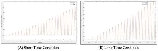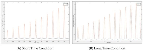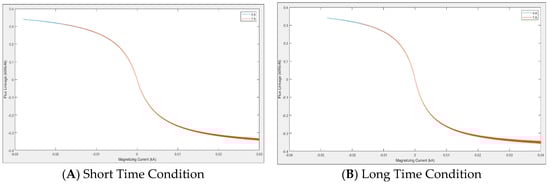 As a result, magnetizing current increases as time increases whilst magnitude of flux linkage decreases with time from steady state conditions, as depicted in Figure 12 and Figure 13, respectively. At time equal to 0.5 s for instance, the corresponding magnetizing currents are 1.8 kA and 3.5 kA for short time and long time durations, with the latter almost double the value recorded during the short time duration.