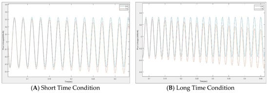 For the first case, the system was tested with a minimum magnitude of GIC of 7 A. The entry point of the GIC into the power system was identified through a grounded neutral at the high voltage side of the power transformer. Figure 11, Figure 12, Figure 13, Figure 14 and Figure 15 show the comparison of flux linkage, active power, magnetizing current and reactive power on short time and long time durations of GIC. A short time condition in this research work refers to one minute while a long time duration refers to three minutes [5]. All figures showing 0 A and 7 A are depicted as blue line and red line, respectively. The blue line represents the impact when GIC is 0 A, which means for a system without GIC, while the red line represents the impact when GIC is at 7 A respectively.