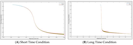 Similar to the scenario in the first case, hysteresis curves were obtained when the T5 was injected with a GIC of 26 A. Figure 16 shows that the transformer is driven into saturation region when GIC flows into its windings. It can be seen that the result is slightly different from the previous case, in particular concerning the long time duration where the curve is much skewed to right, as opposed to the short time duration. This is due to the higher magnitude of GIC injected into the system that caused extreme saturation to occur [65].