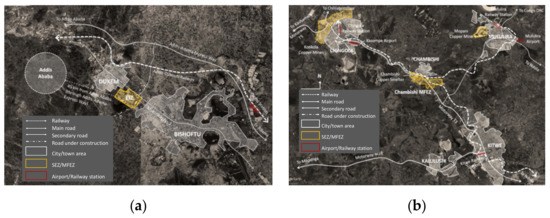 In 2006, the Chinese government announced at the 3rd Forum on China-Africa Cooperation (FOCAC) to cooperate with African countries to build 3–5 SEZs. Since then, a large number of Chinese companies have invested in Africa or have participated in the construction of SEZs in Africa. China’s support for the cooperative zones and growing investment in Africa’s manufacturing have launched a new wave of SEZ development in Africa. By 2018, at least 32 African countries have established about 237 new SEZs (most of them were established after 2015) [35]. The two cases in this study—The Eastern Industry Zone (EIZ) in Ethiopia and Chambishi Multi-Facility Economic Zone (MFEZ) in Zambia, established in late 2006, are the two earliest zones of this new wave and are more comparable among the six earliest cooperation zones established in 2006 (Appendix A). The Eastern Industry Zone is located between the small town of Dukem and the relatively big town of Bishoftu ). According to the Ethiopian census, the two towns had about 100,000 residents in total in 2007. The Chambishi MFEZ is adjacent to the small mining town Chambishi, which had a population of less than 50,000 in 2010 according to the Zambian central statistics office. Around the MFEZ and Chambishi town, there are several populated towns and cities in the Copperbelt region (Figure 1a,b and Figure 2a,b).