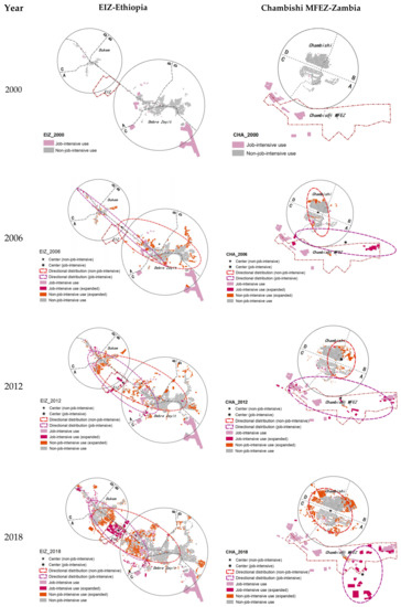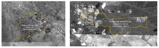 Land use information such as appearances, night lights, and spectral features, has been widely used in previous research to reflect the characteristics of urban expansion visually [36,37,38]. In order to evaluate the extent to which SEZs can change the current uncontrolled and unprofitable urban expansion in the cities where they locate, this study also uses several land-use indicators to depict this impact. The evaluation has been launched based on the land use data collected through field surveys in 2016 and 2018, and the historical images from Google Earth (Appendix A) since 2000. While the construction speed of different projects using various technologies varies a lot in different countries (Appendix A), the division of monitoring period can be tricky. The period should be both short enough to present the structural change of space by stages and long enough to cover the construction period of average-sized projects. The two SEZs involved in this study were established at the end of 2006. Given the available land use information and the average construction speed in Ethiopia and Zambia, land use in four individual years (2000, 2006, 2012, and 2018) were finally selected to monitor the spatial change.