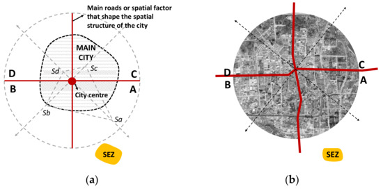 where SPn refers to the area of planned plots and Sn refers to the area of total expansion in a certain monitoring period. The second and third indicators were defined as the “concentration index (CI)” and “primacy index (PI)” of urban spatial expansion. The most prominent spatial representation of uncontrolled urban sprawl is disorderly construction in all directions. The two indicators—The concentration index and primacy index therefore together reflect the extent to which the construction of SEZs has changed the original uncontrolled expansion of the cities, i.e., whether urban expansion happens more in ‘a concentrated way’, especially more in ‘an SEZ-leading way’. Dividing built urban spaces into concentric sectors and evaluating the spatial feature in each sector were used as an effective method to analyze the characteristics of urban expansion in different directions [39]. According to the structural characteristics of the city where the zone is located, the built-up area of the city was divided into four dimensions by main roads or other essential spatial elements (such as rivers, railways, and main roads). The four spatial dimensions were named as A–D dimensions based on their spatial distance from the SEZ (A is the nearest, D is the farthest) (Figure 3a,b).