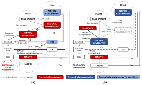 By delivering a suitable spatial plan and providing hardware and software through two public agents—IPDC and EIC (in charge of the hardware and software for SEZs respectively), Ethiopian federal and regional governments actively participated in SEZ development. The government, instead of the zone developer, deals with disputes and contradictions over land use, while SEZs are fully integrated with public urban development plans. SEZs proliferate with firm support from the government and in turn have produced significant economic profits in terms of rent, tax, and spatial appreciation, which return to the developer and the government (Figure 8a). The development ability of the government and its designator (though economically unsustainable for the short term) can be continuously enhanced during the process. It is possible to say that by actively producing public goods—SEZs—the Ethiopian government is making itself a successful entrepreneurial government. Although this enterprise, as Zhao indicates [34], cannot be assessed only by its claimed goals and principals but by its efficiency of input and output, the Ethiopian government’s products—SEZs are indeed reversing urban expansion in a more controlled and profitable way.