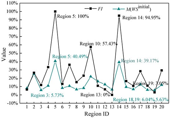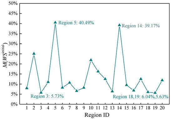 Under disruptions in a region, the components (i.e., nodes and pipes) within the region may be in a failure status, leading to ruining equilibrium and subsequently redistributing the water flow throughout the WDN. This condition results in deficient pressure for some nodes and consequently insufficient water supply with regard to the actual demands in some regions. The water shortages (the importance of functional zones is not considered) for regions in the WDN under a region (region 2/5/6/10/14/20) failure are shown in Figure 6. WSinitial is the water shortage (The importance of functional zone is not considered), is the mean water shortage (The importance of functional zone is not considered) of other regions due to the disruption of a region.