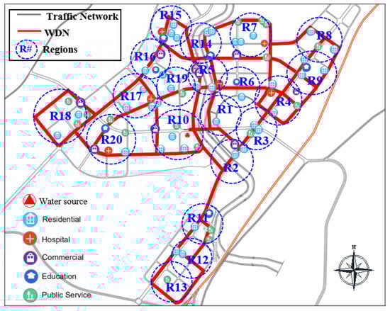 In addition, the same water shortage leads to a greater loss to the urban function zones in charge of critical service (e.g., hospitals), and it is not accurate to evaluate the loss of only by the water shortage in each region. Hence, the distribution characteristics of function zones are considered, and the water shortage considering the function zone importance of a region (WS) is used to indicate the region loss. Figure 8 shows the general distribution of function zones supplied in the WDN. Considering the water shortage and the distribution characteristics of urban function zones, the water shortage by a disruption in the WDN can be analyzed comprehensively.