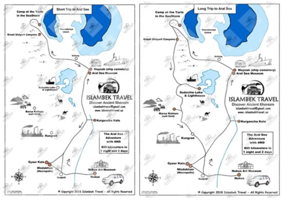 Tourists arriving in Khiva drive to the Aral Sea while passing through the 5 or 10 ancient fortresses during their 10 h journey (Figure 2). Long trips are favored by tourists when they want to discover more about the sea, desert, fortresses and lakes, while a short trip is less expensive and provides a general introduction to the Aral Sea and its surroundings. The desert’s beauty and dry continental weather help visitors explore more about the climate and environmental situation in the region. Passing through canyons and staying overnight on the seashore expands visitors’ insights into the enormous industrial potential of the 1960s. Rich flora and fauna show the region’s diverse nature and climatic conditions. Indeed, the ancient Khorezm fortresses (i.e., Ayazkala, Tuprakkala) teach visitors about early human civilization in the region in the 3rd through to the 1st century BC [15].