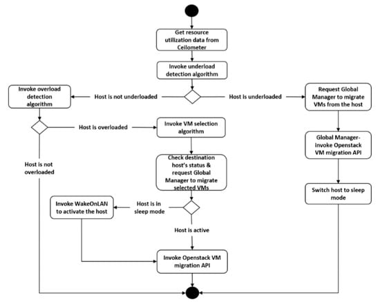 Underloaded hosts were identified by invoking an underload detection algorithm (i.e., THR—Threshold based Heuristic). When the host was under-utilized, the local manager requested the global manager to migrate the VMs from the host using Openstack VM migration API [97] and put the host to sleep mode. On the other hand, if the host was not under-utilized, an overload detection algorithm (i.e., THR-threshold-based Heuristic; MAD-median absolute deviation; LRR-local regression robust) was invoked. If the host was not overloaded, the resource monitoring processes continued. If the host was overloaded, VMs to be relocated were selected by invoking the VM selection algorithm (i.e., RC-random choice; MMT-minimum migration time) and placed in a suitable host via VM placement algorithm (i.e., BFD-best fit decreasing). The status of the destination host was checked before the global manager migrates the VMs. If the host was in sleep mode, the host was awakened by sending magic packets using WakeOnLAN standard [98].