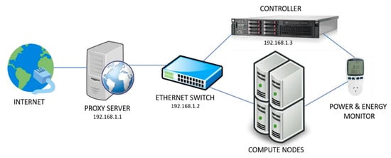 Figure 6 depicts the experimental set up. The controller and compute nodes were plugged into the power source through plug-in power and energy monitors. The nodes were connected to the internet through a secure proxy server via a 24-port ethernet switch. Two network interface cards (NICs) were present for each node, NIC1 provided access to the internet while NIC2 was connected to the management or internal network. In Openstack terms, the public IP obtained by each virtual machine is called the floating IP address [79].
