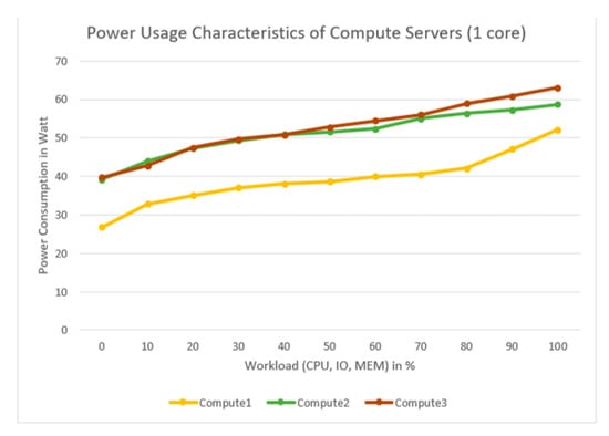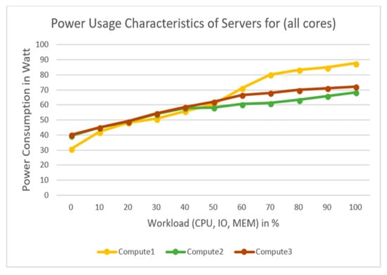 It is observed that for similar workloads, the power usage characteristics of servers with single core and multicores are different and this is affirmed by [52]. From Figure 7, it is evident that both Compute2 and Compute3 consume approximately similar amount of power. However, Compute1 consumes less power compared to the other compute nodes when one of the cores is stressed. This is due to the fact that the i7 processor is optimized for power consumption compared to the Core 2 Duo processors [52]. On the contrary, when all the cores are stressed (see Figure 8), the PPC of Compute1 changes drastically particularly, when the workload is more than 50%. The turbo boost feature of the i7 processor could be responsible for this behavior [104]. The turbo boost feature of i7 processors reduces up to 6% percent of the execution time at the cost of increasing the energy consumption by 16% [105]. By comparing Compute2 and Compute3, the average PPC value is approximately 60W when workload is 50% for both cases. However, when the workload increases from 60% to 100%, Compute3 tends to consume more power than Compute2. Several factors could be responsible for this behavior, one of which is the electronic hardware ageing phenomenon [106]. The above analysis shows that to reduce overall energy consumption during data processing, it is important to reduce the peak power consumption by effectively identifying the underloaded and overloaded hosts, followed by reducing the number of active hosts via putting the other hosts to an idle mode. The idle mode power consumption of the compute nodes is negligible as shown in Table 2.
