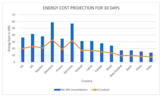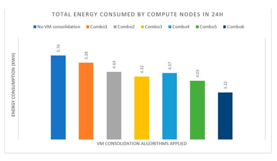 The experimental results for the investigation of the impact of six different VM consolidation ‘combos’ on energy consumption is illustrated in Figure 9.