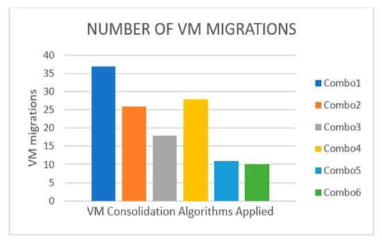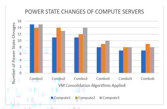 From Figure 10, it is shown that Combo6 has the least number of VMs migrated. The combination of LRR prediction of resource utilization and MMT’s strategy to select VMs based on minimum time taken to migrate is effective in saving energy, causing the least migration overhead. Combo5 is the second-best method with less VM migrations. From Figure 10, it is observed that the minimum migration time (MMT) algorithm performs better than random choice (RC) in keeping power state changes to an optimal level as ‘combos’ that employ MMT (i.e., Combos 4, 5 and 6) have less changes in power states than ‘combos’ (i.e., Combos 1, 2 and 3) that apply RC algorithm.