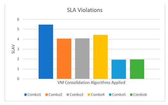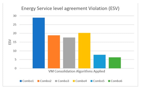 SLA violations (SLAV) metric is computed from SLATAH and PDM for each combo. From Table 5, it is observed that Combo5 (MAD and MMT algorithms applied) has the least SLA violations followed by Combo6 (LRR and MMT). Threshold-based Heuristic (THR) and random choice (RC) algorithms cause most SLA violations and are not as effective as MMT, MAD and LRR. The energy service level agreement violation (ESV) metric in the case of Combo6 is reduced by the energy consumption factor. The balance between energy saving and SLA violations is expressed by ESV [71]. Although Combo5 has less SLA violations, the energy consumed (4.03 kWh) is more compared to Combo6 (3.22 kWh). Figure 12 and Figure 13 present graphs of SLAV and ESV respectively. The results obtained are similar to the results presented in [67]. The experimental results for the effect or overhead caused by the virtualization layer on peak power consumption, CPU and memory utilization, are presented in Table 6. Notations ‘A’ and ‘B’ in Table 6 denote ‘No virtualization enabled’ and ‘Virtualization enabled by KVM, Openstack and Openstack NEAT’, respectively. It is clear that the increase in PPC caused by the virtualization layer is negligible (in the order of less than 1 Watt of power) and less than 0.5% of CPU and memory utilization.