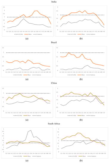 The results for the non-parametric causality-in-mean and causality-in-variance running from GPR to tourism stocks are presented in Figure 1. For each country, the effects of local and global GPR, shown in parallel, are presented in panels (a) and (b), respectively. For all countries, the first-moment causality (causality-in-mean) and the second-moment causality (causality-in-variance) are shown for their local GPRs as well as for global GPR. In each causality figure, the horizontal axis represents quantiles (ranged between 0.10 and 0.90) and the vertical axis denotes test statistics. The quantile range 0.10–0.25 represents extreme negative returns or bearish market conditions while the quantile range 0.75–0.90 corresponds to extreme positive returns or bullish market conditions. Similarly, the quantiles 0.25–0.75 indicate average returns or normal market conditions. The orange and grey lines indicate causality-in-mean and causality-in-variance, respectively, whereas the dashed line signifies 5% critical value.