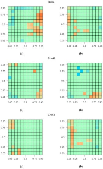 Figure 2 includes the heat maps showing the directional predictability results from local and global GPR to the tourism stock returns of a country in panels (a) and (b), respectively. On the x- and y-axes, the quantiles hits indicate the distribution of the variable’s quantile (q = (0.05, 0.10, 0.20, 0.30, 0.40, 0.50, 0.60, 0.70, 0.80, 0.90, 0.95)). Note that the heat map shows the 121 cells of the quantile combinations of variables and the color scale indicates the correlation between −1.0 and 1.0. In each cross-quantilogram figure, the x-axis represents quantiles of local and global GPR, and the y-axis denotes the returns quantiles of tourism indices. Although the quantiles range from 0.05–0.95, the key points are marked at 0.05, 0.25, 0.50, 0.75, and 0.95 in order to distinguish between various market conditions. The return quantiles 0.05–0.25 represent extreme negative returns or bearish market conditions while the quantiles 0.75–0.95 correspond to extreme positive returns or bullish market conditions. Similarly, the quantiles 0.25–0.75 indicate average returns or normal market conditions. The red, blue, and green colors represent a positive, negative, or no association (predictability) between (from) the previous month’s values of local or global GPR index and current month returns of tourism indices of a country, respectively.