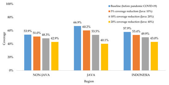 Basic childhood immunization coverage in Indonesia has fluctuated in the last decade, but currently appears to be declining [8]. The latest survey reported that the proportion of fully immunized children at the age of 12–23-months-old was only 58%, which was lower than the targeted coverage by the government at 93% [8]. Due to the impact of the COVID-19 pandemic, a recent study estimated the basic childhood immunization coverage would be 53%, 50%, and 43% for the respective scenarios of immunization coverage reductions at 5%, 10%, and 20% [36]. The study considered the impact of the pandemic in reducing immunization coverage would be doubled in all provinces of Java, since this island is the epicenter of the COVID-19 pandemic in Indonesia (see Figure 3).