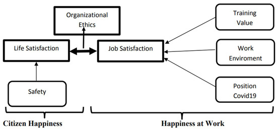 Job satisfaction fosters happiness in the worker, which leads companies to prioritize strong ethical values and social responsibility. To measure citizens’ happiness, we can directly ask respondents about their satisfaction with their life, and also approach it indirectly by asking them about the safety of their environment. In the case of happiness at work, we will focus on the job satisfaction indicator, but include the effects of proactivity towards training, the work environment, and the company’s social responsibility, based on its response to the COVID-19 pandemic (Figure 1).