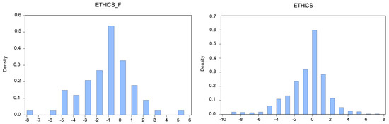 Histogram (density) of organizational ethics: Financial (_F) and non-financial.
