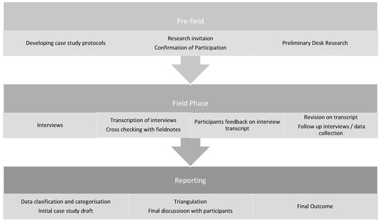 While a case study is commonly preferred, especially when the researcher has little control over the event and when the focus is on contemporary phenomena within some real-life context, adopting systematic steps in data collection and analysis has been recommended to ensure the rigor of the research [69]. In doing so, this study adopted several operational steps suggested by [68] including (1) pre-field phase, (2) field phase and (3) reporting phase (see Figure 1).
