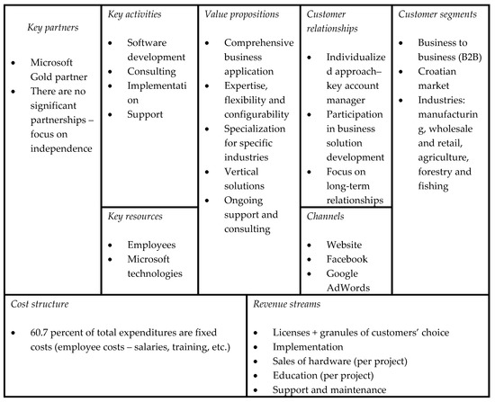 Case 1 was a small firm founded in 1991. The firm has four owners, and in 2018, they employed 45 people. It was founded by four co-owners, who had previously worked together for many years. All four owners had equal shares in the firm, all four of them worked in the firm, and each was in charge of a different segment of the business. Figure 1 shows the Business Model Canvas of the firm. Since its founding, the firm has been involved in various activities in the ICT industry, but software development has always been the fundamental idea. The firm started with hardware sales, school of informatics, computer repair service, however, the firm today focuses on its main product, a business application for the integration of business processes and an improvement in business operations. Their product is the dominant EAS (Enterprise Application Suite) in the Croatian market, where they have numerous customer references. The firm has a customized value proposition for each customer operating on the Croatian market (with the possibility of continuing cooperation with existing clients who decide to expand internationally). The firm uses its website as the main sales channel, without intermediaries and partners. Customer relations are extremely important, and the firm has a personalized approach for each client. The firm is focused on several specific activities. It is quite clear that intellectual capital, which derives from employee knowledge, is crucial for the firm, and since employee costs make up the largest part of the cost structure, this means that the firm has a high share of fixed costs. The firm wants to build independence, and does not have partners. The revenue streams of the firm consist of the sales of services and various after-sale and complementary activities (implementation, consulting, and support). The firm is aware of its strategic position—its strengths and weaknesses—as well as the opportunities and threats in the environment. They are aware of their position in relation to the competition, which they regularly monitor.