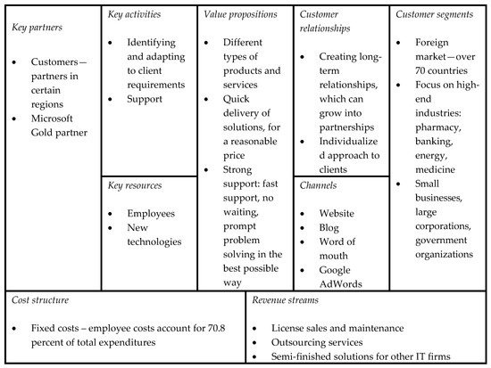 Case 2 was founded in 2003, by three co-owners, and by 2018, it had grown and employed 50 people. Case 2 is developing its business in three directions: sales of finished products (applications for high-end industries), outsourcing; and solutions for other software firms. Their Business Model Canvas is shown in Figure 3. The firm has a fully customized value proposition for its customers, especially in the case of outsourcing. Customers are from all around the world, and the firm does business with clients in a large number of countries. Their website is the main sales channel, but sales are also made through intermediaries/partners in certain countries, with which the firm has formalized and non-formalized relations. This firm performs several specific activities, which is reflected in their value proposition. However, what is common for all activities is their continuous and fast client support, and urgent problem solving. The most important resource of this firm are its employees, who always use cutting edge technologies, and their knowledge becomes the intellectual capital of the firm. With regard to employees as the key resource, fixed costs have the highest share in the firm’s cost structure. Revenue streams come from the sales of products and services, and after-sale support. It is evident that the firm knows its strengths and weaknesses, knows its competition, and what are the relationships between companies in the market. The owners are aware that they have to be competitive in terms of everything they offer, so they observe the competition, their offering, prices, and the way they provide customer support. Trends in technology development are crucial, as they strive to be a firm that builds its business on the latest technologies.