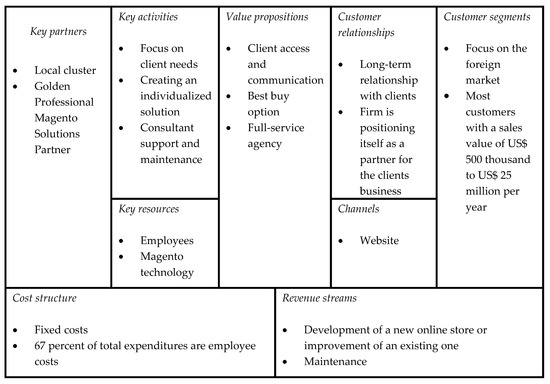 Case 3,was founded in 2008 by one owner, while in 2018, it had four co-owners and employed 47 people. Since the very beginning, the firm decided to specialize in one type of service: the development of web shops on the Magento platform. Thus, the main activity of the firm is the development of solutions for online sales, from the idea and concept to launch and maintenance of the web shop. This includes designing, building, and optimizing an existing online store, introducing another platform, or creating an online store from scratch. The solutions they provide do not consist only of the online store, but often include various integrations with the client’s existing systems such as Enterprise Resource Planning (ERP), various marketing channels, paying devices, delivery calculations, and synchronization with courier services. The Business Model Canvas of the firm is show in Figure 5. The firm offers a fully customized value proposition for customers operating on the global market. The sales are direct, and without intermediaries and partners in the process. Customer relationships are fully customized, a relationship is built with each customer, and the firm often becomes an important partner for the development of the client’s business. The firm is specialized and engages in distinctive activities within a narrow domain, namely the development of online stores, on a specific platform. Employees are the firm’s main resource and due to their importance, they are the firm’s biggest expense. The firm’s revenue comes from the sales of services and after-sale and complementary activities. All components of the business are continuously analyzed and there is a strong focus on continuous improvement. They are aware of competition at the local and global level, and everyone in the firm is in charge of monitoring trends.