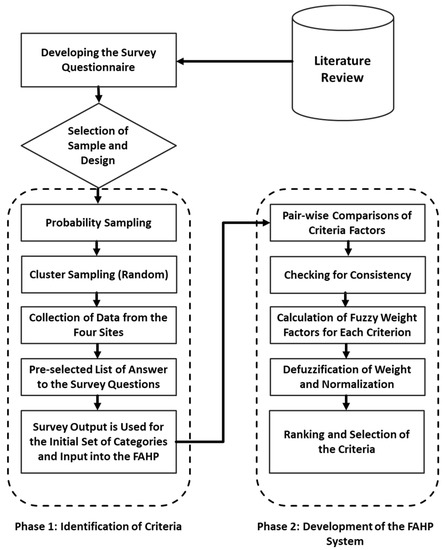 In this paper, a fuzzy MCDM called the fuzzy analytical hierarchy process (FAHP) is used to evaluate the survey answers. It is considered a fuzzy version of the typical analytical hierarchy process (AHP), where it evaluates subjective data objectively and checks its consistency from the uncertain respondents [26,27,28,29]. According to Mardani et al. [24], the FAHP model alone scored the third-highest usage after a hybrid fuzzy MCDM and AHP with 199 applications in various studies from improving business management [30] and developments of the supply chain [31] to even urban studies such as transport developments [32] and driver behaviors [33]. From the literature, most MCDM papers discuss utilizing the MCDM tool itself for evaluation and analysis [24,34,35,36,37]; they integrate different types of MCDM tools for better results [30,31,38], and most of the MCDM papers fall into four main fields: engineering, business and management, science, and technology [39,40,41,42]. However, there are two shortages of literature in applying the FAHP method. First, despite the extensive research on utilizing the FAHP in urban area studies [25,27,39,40,41,42], there are no studies related to establishing new criteria for walkability measures using the FAHP. Second, the FAHP is mostly used to analyze the researchers’ criteria rather than the participants themselves.